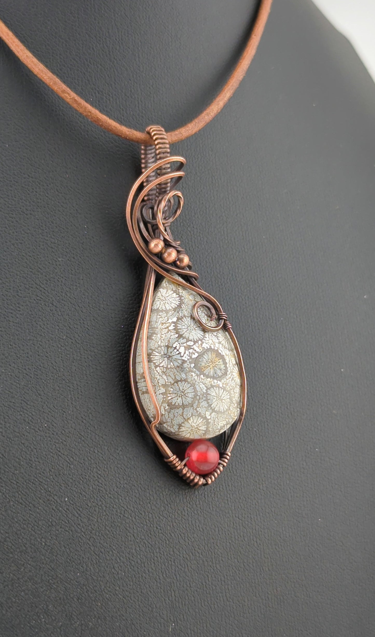Coral Fossil Pendant, set in antiqued copper, accented with Carnelian.
