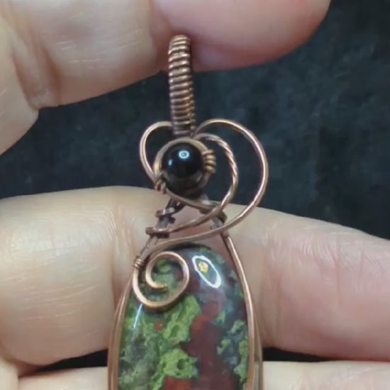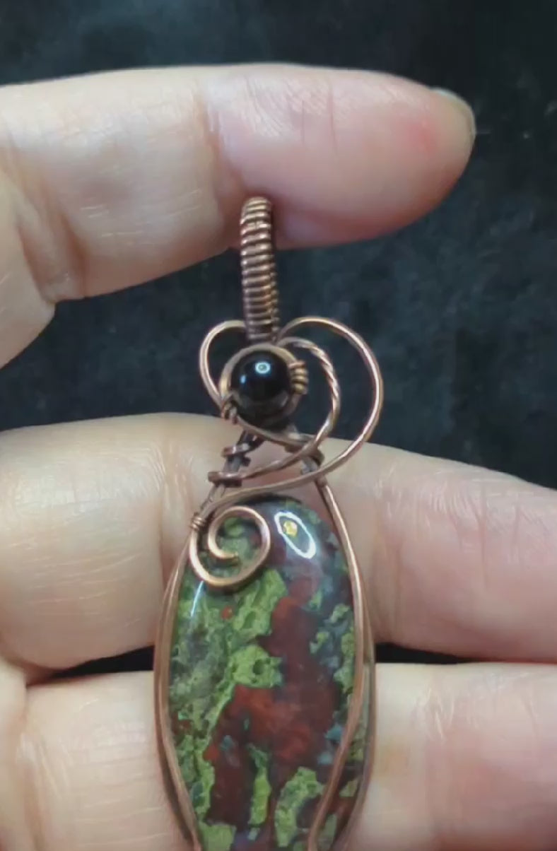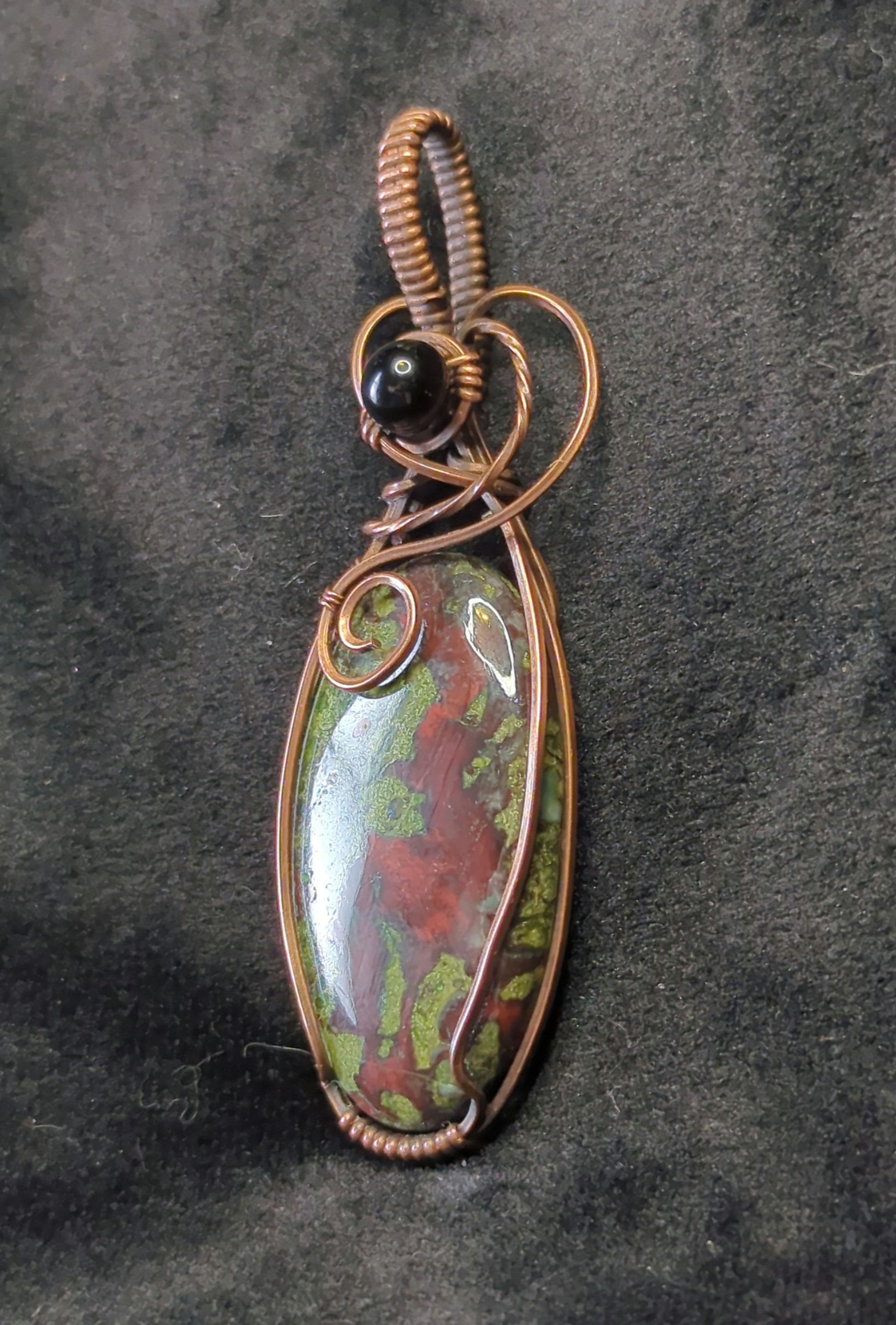 2⅝" Dragons Blood Jasper, set in antiqued copper, accented with black agate.